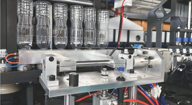 采用伺服電機驅(qū)動環(huán)形鏈條; 采用伺服單通道上胚; 采用鋁合金制造的高壓吹氣組合閥,可有氣體回收裝置,減少能源消耗,保護環(huán)境; 采用PID恒定控制烤箱瓶胚加熱和風機排風。